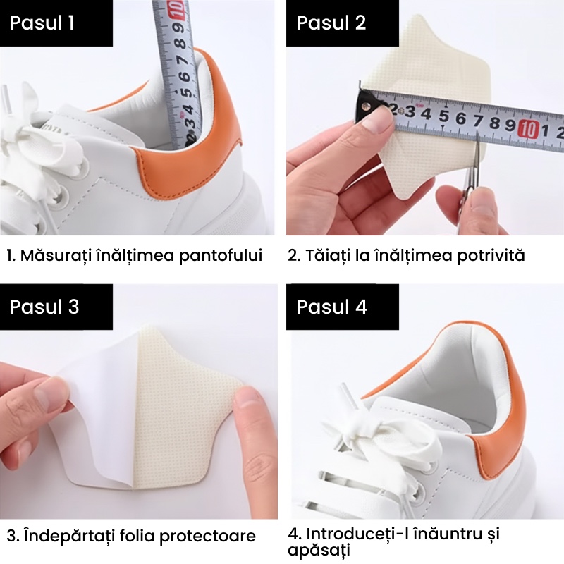 - Aplicare Ușoară: Designul autoadeziv face montarea extrem de simplă. Doar dezlipește și lipește pe interiorul călcâiului pantofului.